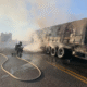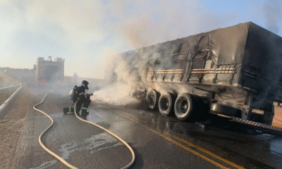 Segundo o Corpo de Bombeiros, o incêndio começou nos pneus do veículo e, em seguida, atingiu o semi reboque da carreta, que estava carregada com adubo....